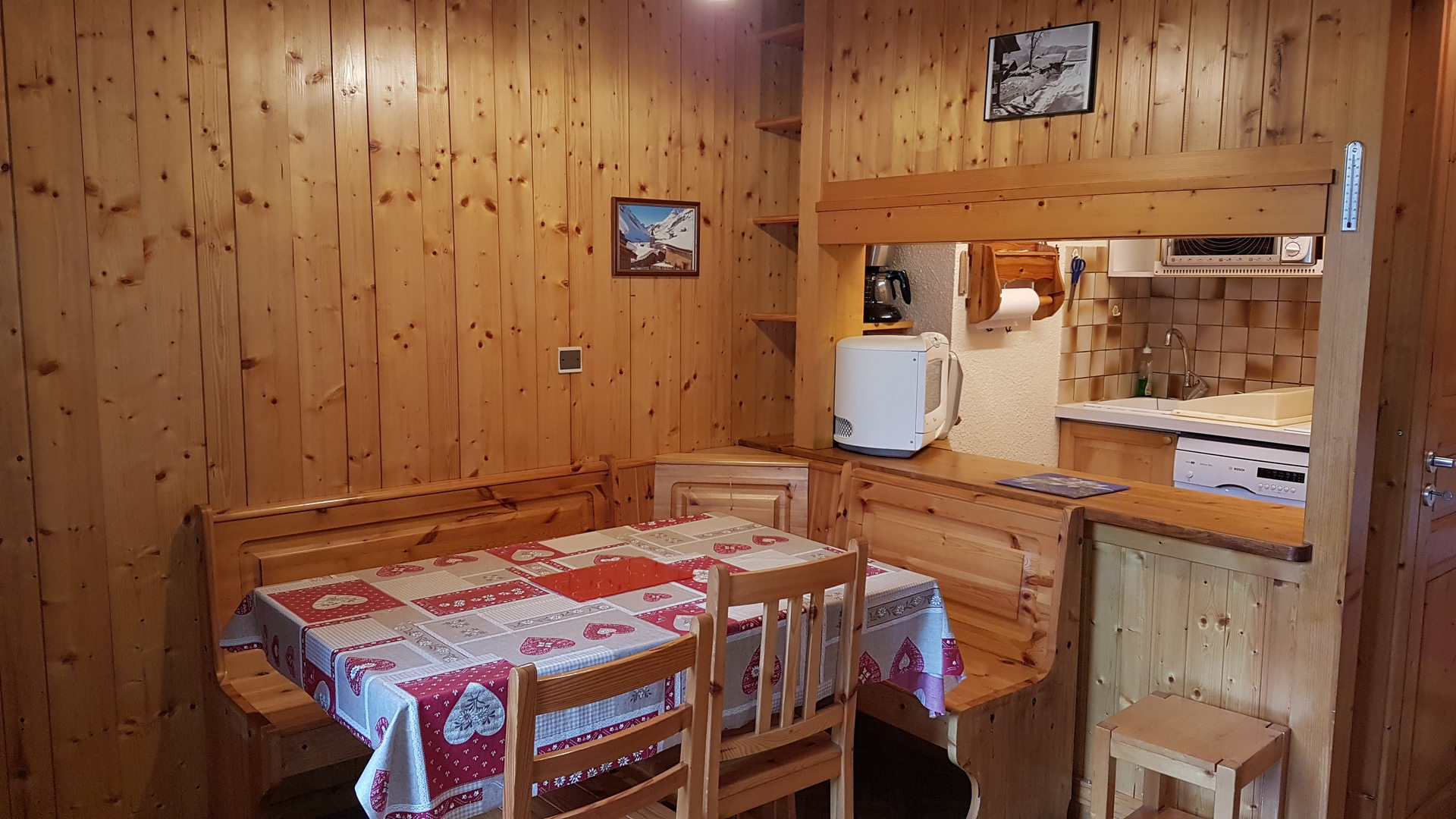 COIN-CUISINE avec lave-vaisselle, four, micro-ondes, plaque électrique 4 feux, hotte, réfrigérateur, cafetière, bouilloire, grille-pain, mixeur, appareil à fondue, appareil à raclette/fondue.