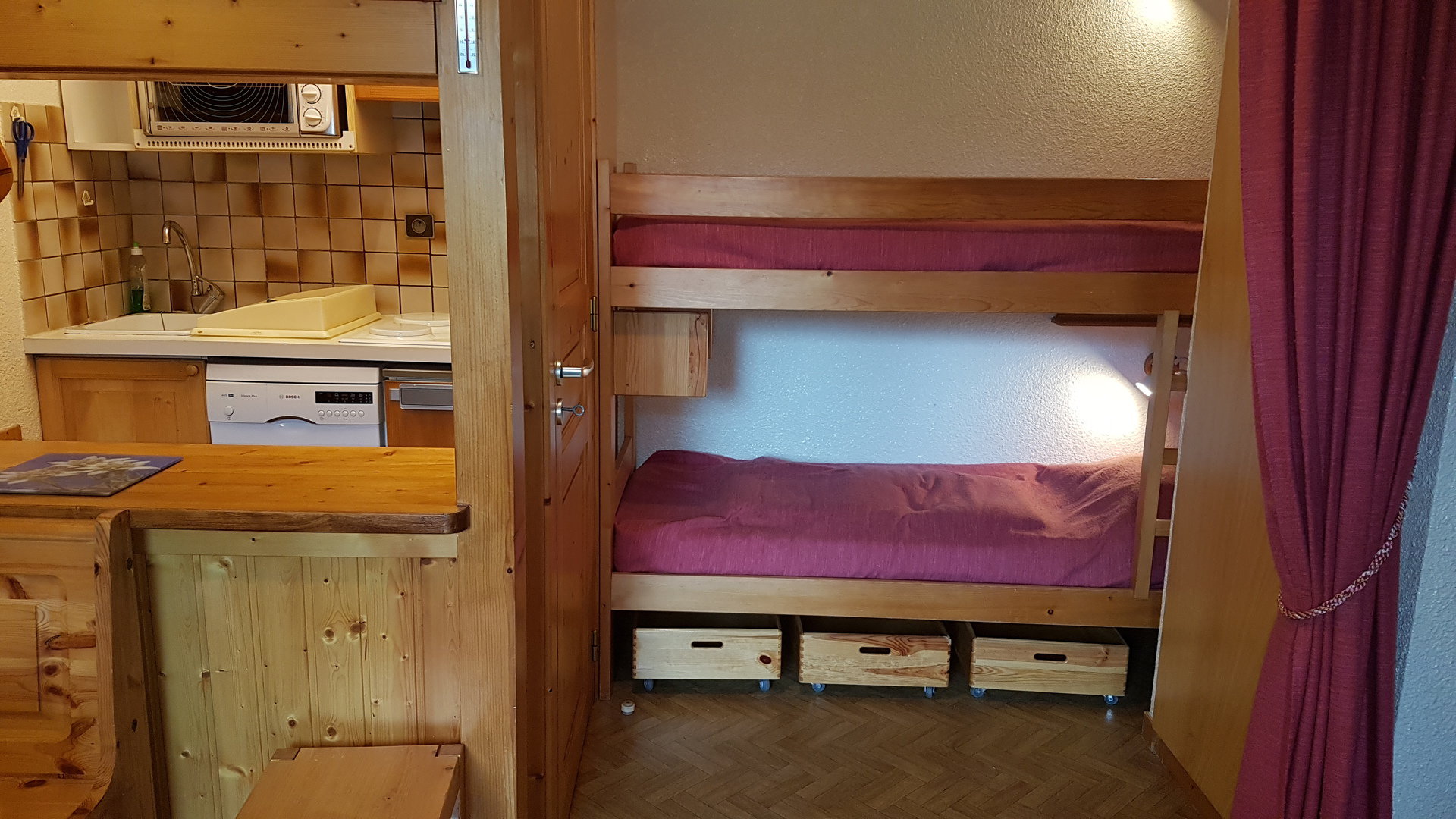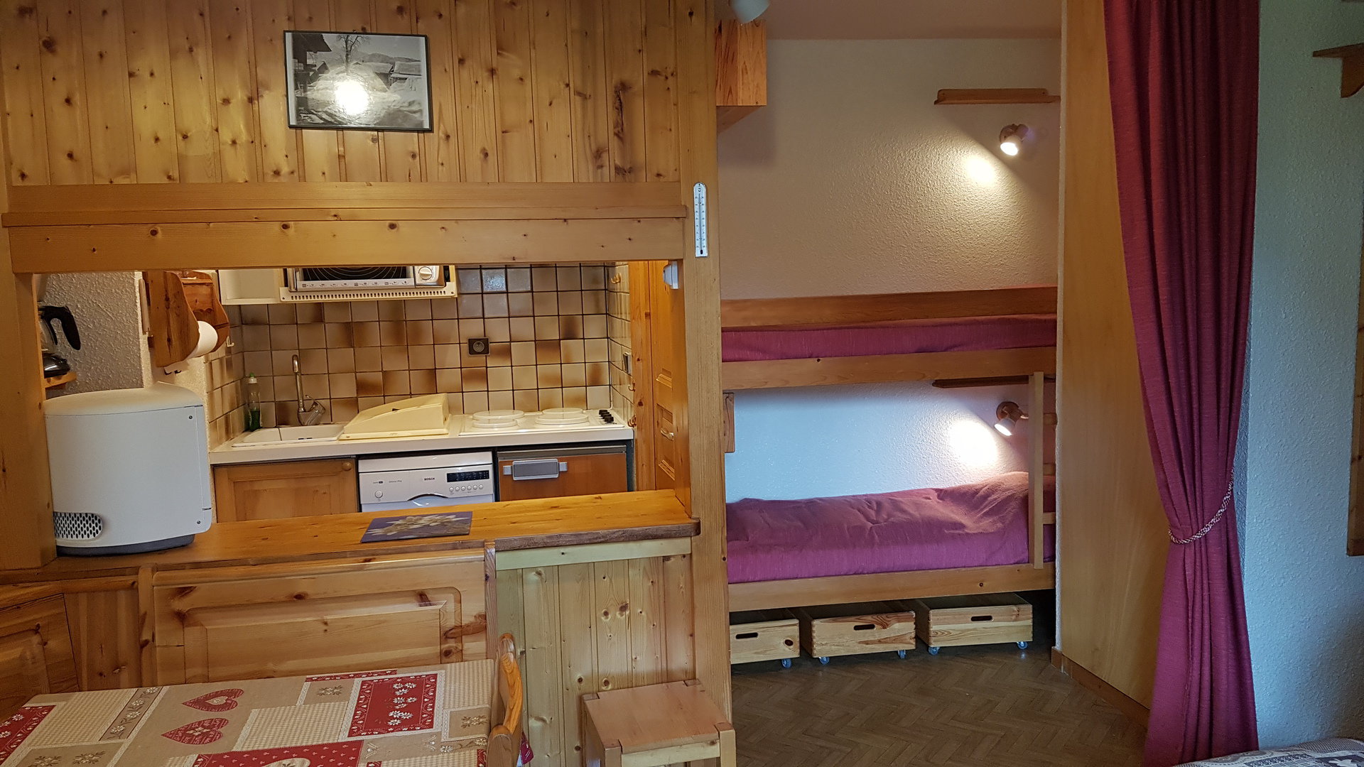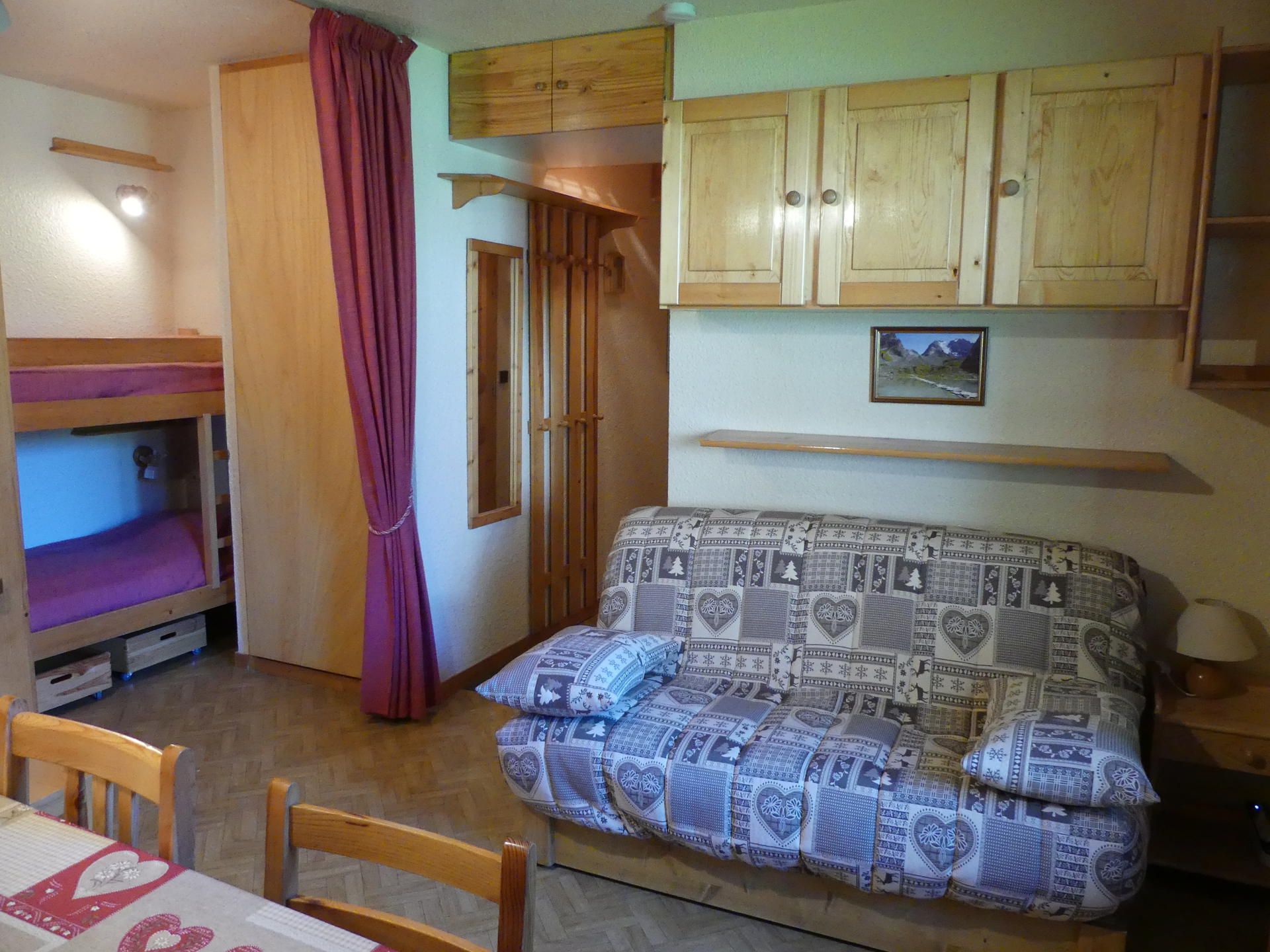 DEGAGEMENT avec 2 lits superposés. (Le couchage en hauteur ne convient pas aux enfants de moins de 6 ans).