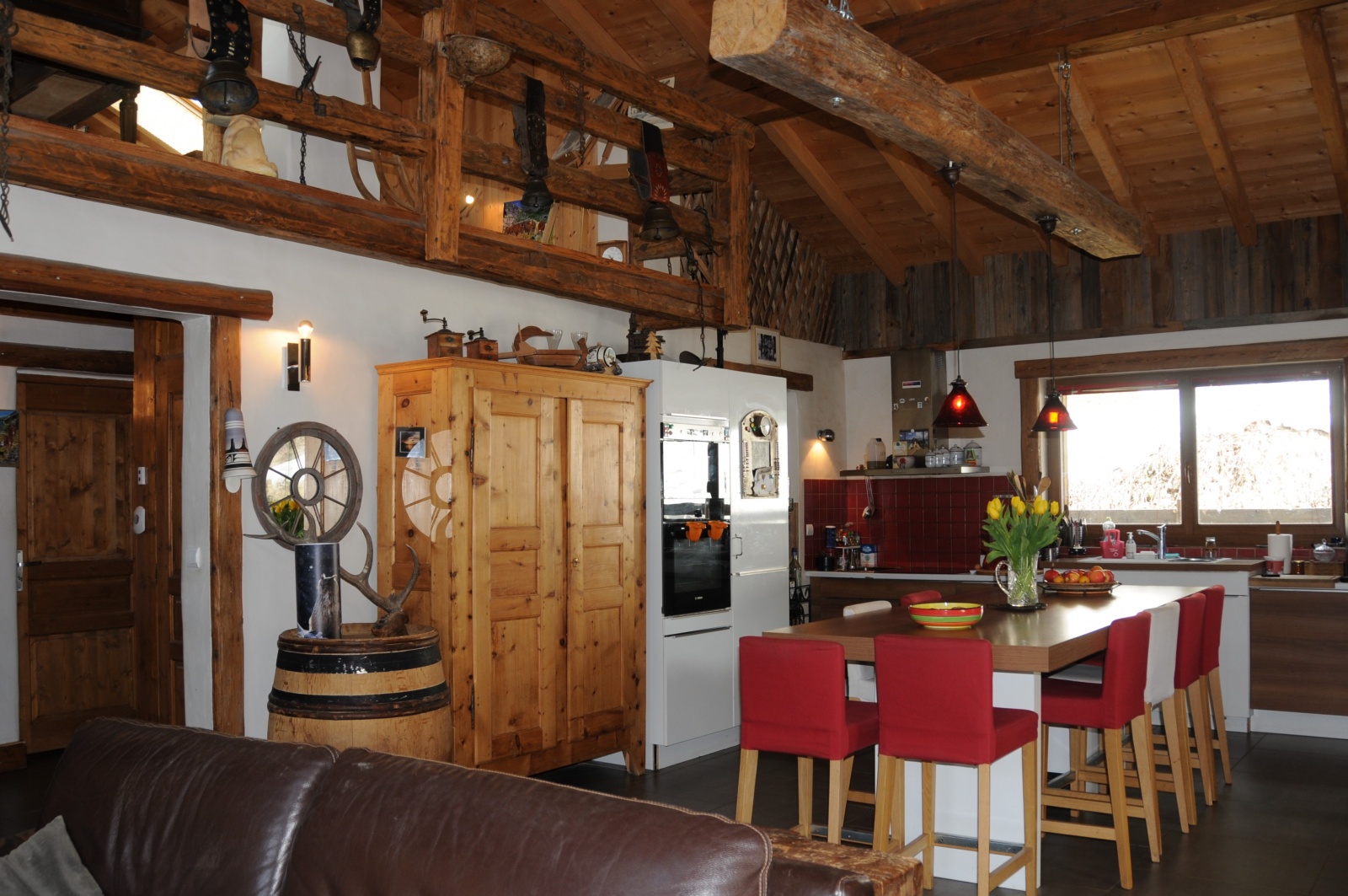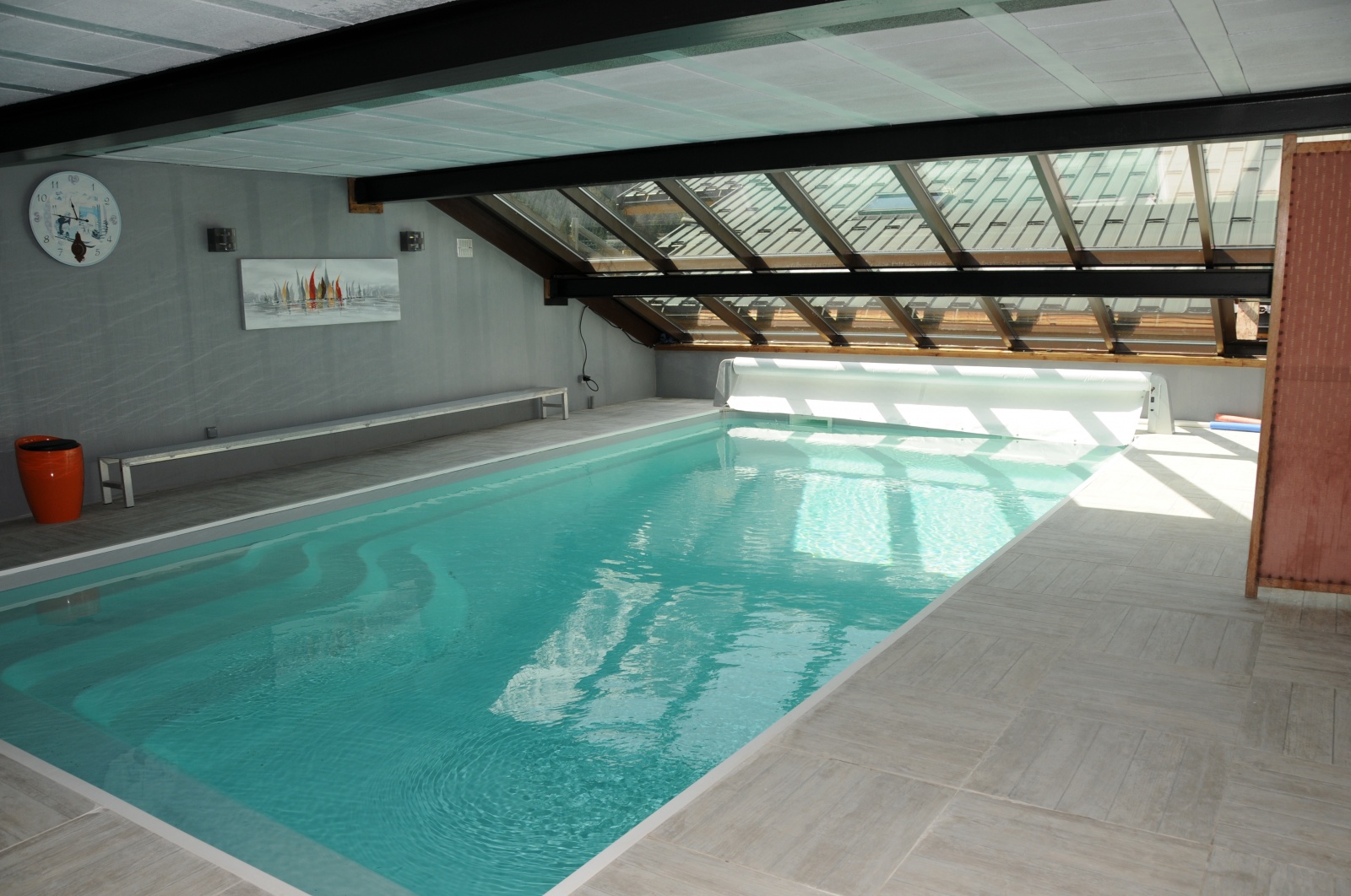 - avec la magnifique piscine chauffée de 8 m x 4 m et de profondeur 1,50 m avec escalier, accessible depuis l'intérieur mais également l'extérieur du chalet ; plancher chauffant, douche, déshumidificateur et grand pan entièrement vitré permettant de profiter du soleil et de la vue exceptionnelle sur les montagnes.