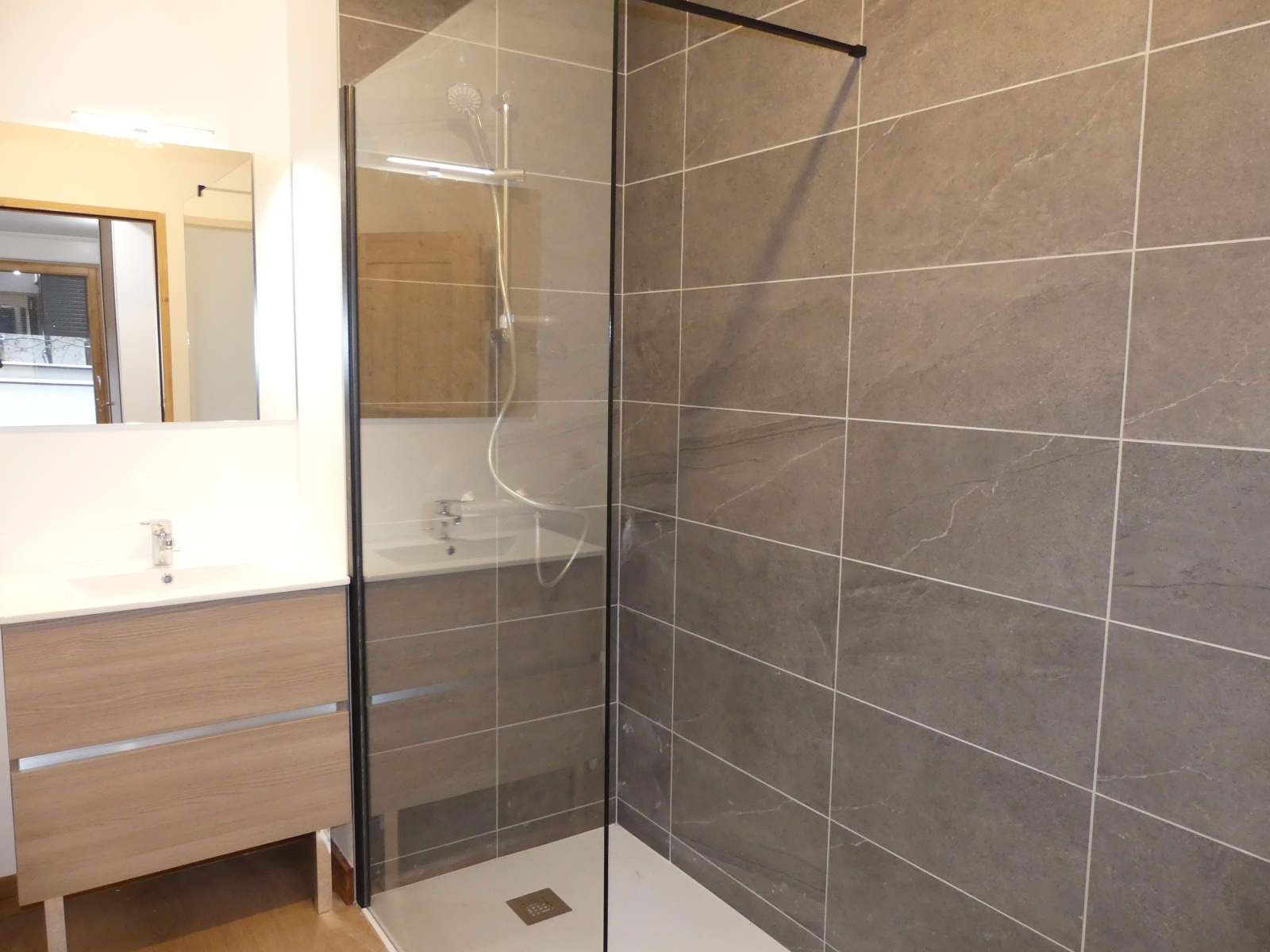 - Faïence ardoise dans la salle d'eau avec meuble salle de bain coloris chêne